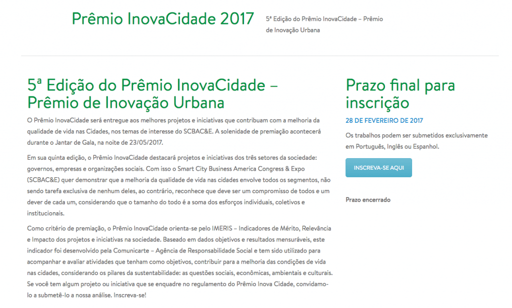 Anúncio do prêmio no site do ISCBA, disponível no endereço http://smartcitybusiness.com.br/2017/premio-inova-2017/ em maio de 2017.