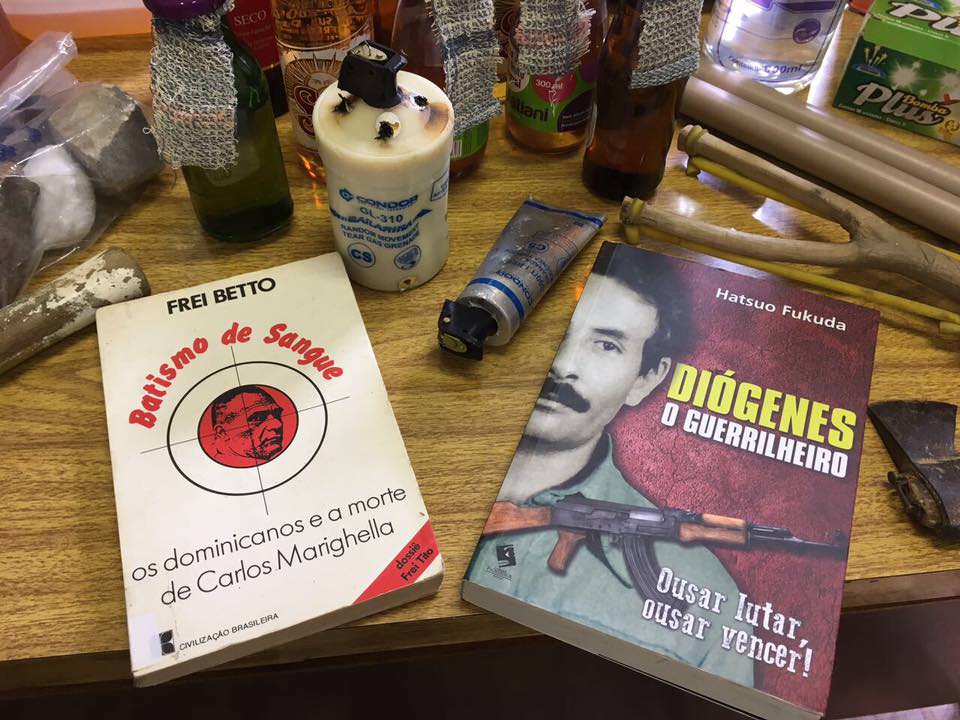 Material apreendido pela polícia no prédio público em Porto Alegre: bombas, foguetes, coquetéis molotov e literatura de guerrilha.