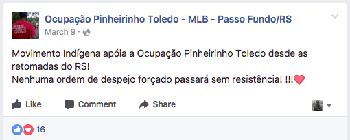 Entidades de Passo Fundo se unem ao grupo e dão suporte intelectual aos invasores destas áreas. O CDHPF (Comissão de Direitos Humanos de Passo Fundo) já publicou em seu site textos completos sobre a questão e tem posição ideológica bem definida. Na publicação “Nasce a ocupação Pinheirinho Toledo em Passo Fundo”, disponível em http://cdhpf.org.br/noticias/nasce-ocupacao-pinheirinho-toledo-em-passo-fundo/ – encerra o texto com o lembrete de que “não vai ter despejo, vai ter luta”. Recentemente, o CDHPF produziu um evento em parceria com a UPF, o VII Colóquio Nacional de Direitos Humanos, com o mote “Direitos sociais são direitos humanos, nenhum direito a menos”. A lista de entidades participantes inclui Ifibe – Filosofia Berthier, Colégio Notre Dame, Itepa Faculdades, Instituto Federal de Educação, Ciência e Tec Tecnologia, UFFS e UFRGS.