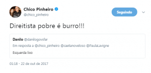 O jornalista Chico Pinheiro, o maior concorrente do Louro José nas manhãs da Rede Globo, usou sua conta no Twitter para sentenciar: “Pobre de direita é burro”. Ele não se deu ao trabalho de dar maiores explicações. Poderia ter feito outras postagens para apresentar algumas das premissas que o levaram a essa conclusão. Como não o fez, me dou ao trabalho de examinar a frase e o que levou Chico Pinheiro a escrevê-la.