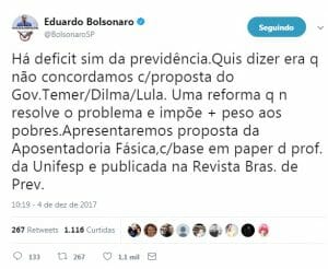De um dia para o outro, Eduardo Bolsonaro mudou seu posicionamento sobre o déficit previdenciário. No dia 3 de dezembro, foi taxativo: “a previdência não é deficitária”:
