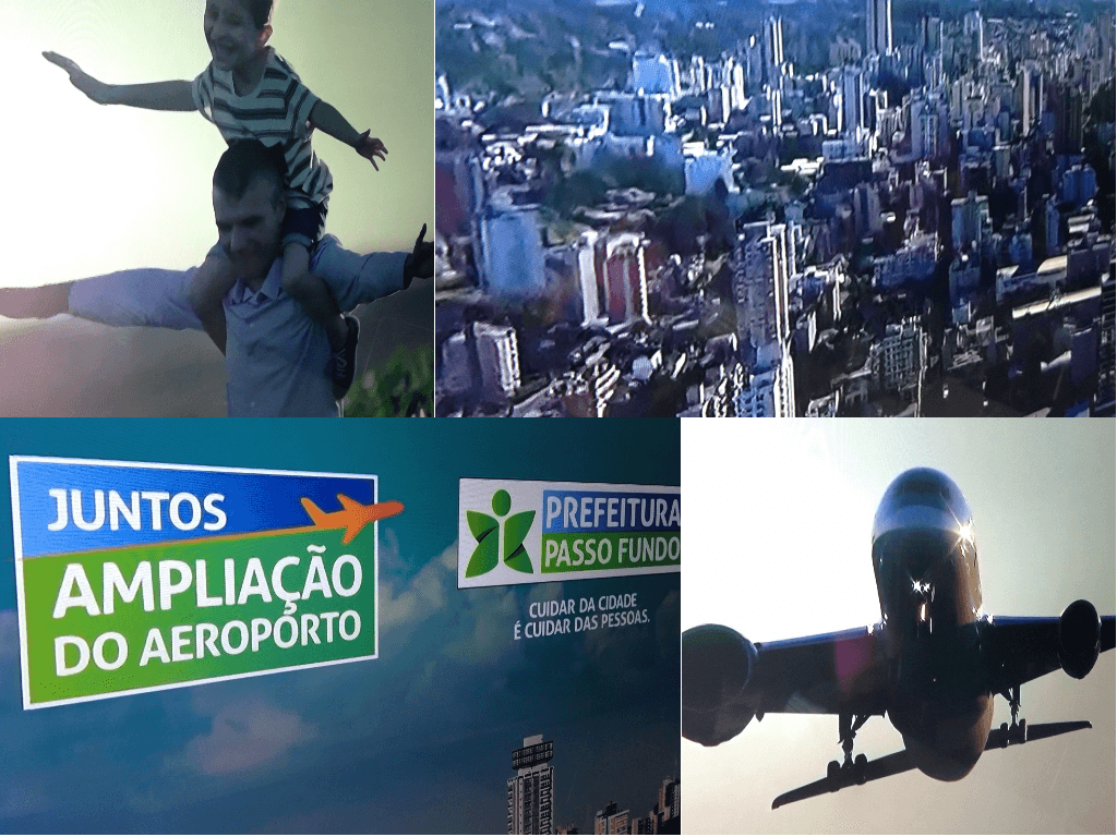 Cenas do comercial da Prefeitura na RBS TV: dramatização, arte de agência e avião incompatível com o aeroporto de Passo Fundo.