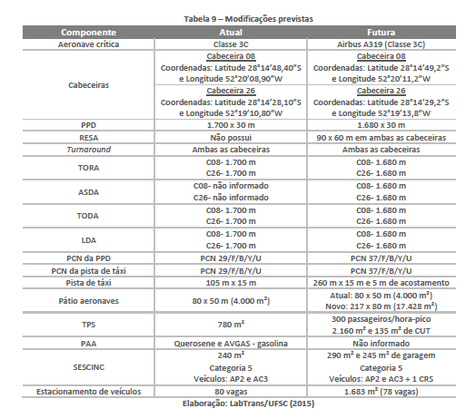 Resumo das modificações previstas, segundo o plano diretor para o Aeroporto de Passo Fundo.