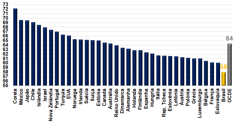 O Brasil é um dos poucos lugares no mundo onde não há idade mínima para a aposentadoria. Por conta disso, a requisição ocorre, em média, aos 58 anos, bem acima do valor da OCDE (64 anos), conforme o gráfico abaixo. No caso do funcionalismo público, por exemplo, algumas categorias, como é o caso dos professores e dos policiais, podem se aposentar ainda mais cedo do que a média em virtude da permissividade das regras, gerando uma brutal diferença na comparação com os mais pobres. Para o Rio Grande do Sul, por exemplo, cerca de 80% das aposentadorias são ditas especiais, ou seja, exigem menor tempo de contribuição em relação às demais.