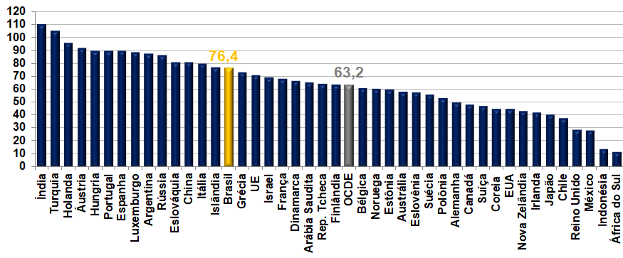 Outro fato que chama a atenção diz respeito à taxa de reposição do Brasil (76,4%), que representa o tamanho do benefício previdenciário em comparação com o salário médio da economia. Quanto maior o valor, portanto, mais generoso é sistema. Para a média da OCDE, esse percentual cai para 63,2%, segundo as estatísticas da OCDE.