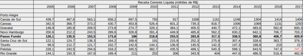 Evolução da RCL: todo mundo cresceu, mas o destaque ficou com Caxias do Sul e Canoas. São as únicas cidades com valores acima de 1 bilhão de reais (1,4 e 1,2 – respectivamente). Passo Fundo vai de 126,1 milhões em 2005 para 429,9 em 2017.