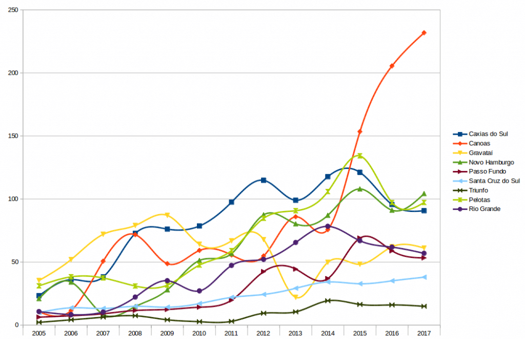 Gravataí e Pelotas apresentam realidades diferenciadas na questão da Dívida Consolidada Líquida. Ambas partem de percentuais altíssimos em 2005 (perto dos 90%) e vão diminuindo até 2017, com um pequeno deslize da Capital dos Doces em 2015. Em 2017, emboladas no pódio das mais endividadas estão Pelotas, Canoas e Passo Fundo*. Notem que a situação de Passo Fundo começa a ficar ruim em 2014, subindo a ladeira até 2017. Entre as 9 cidades, é a que apresenta o pior comportamento. Menção honrosa para Novo Hamburgo e Rio Grande, zeradas na dívida desde 2010 e 2011.
