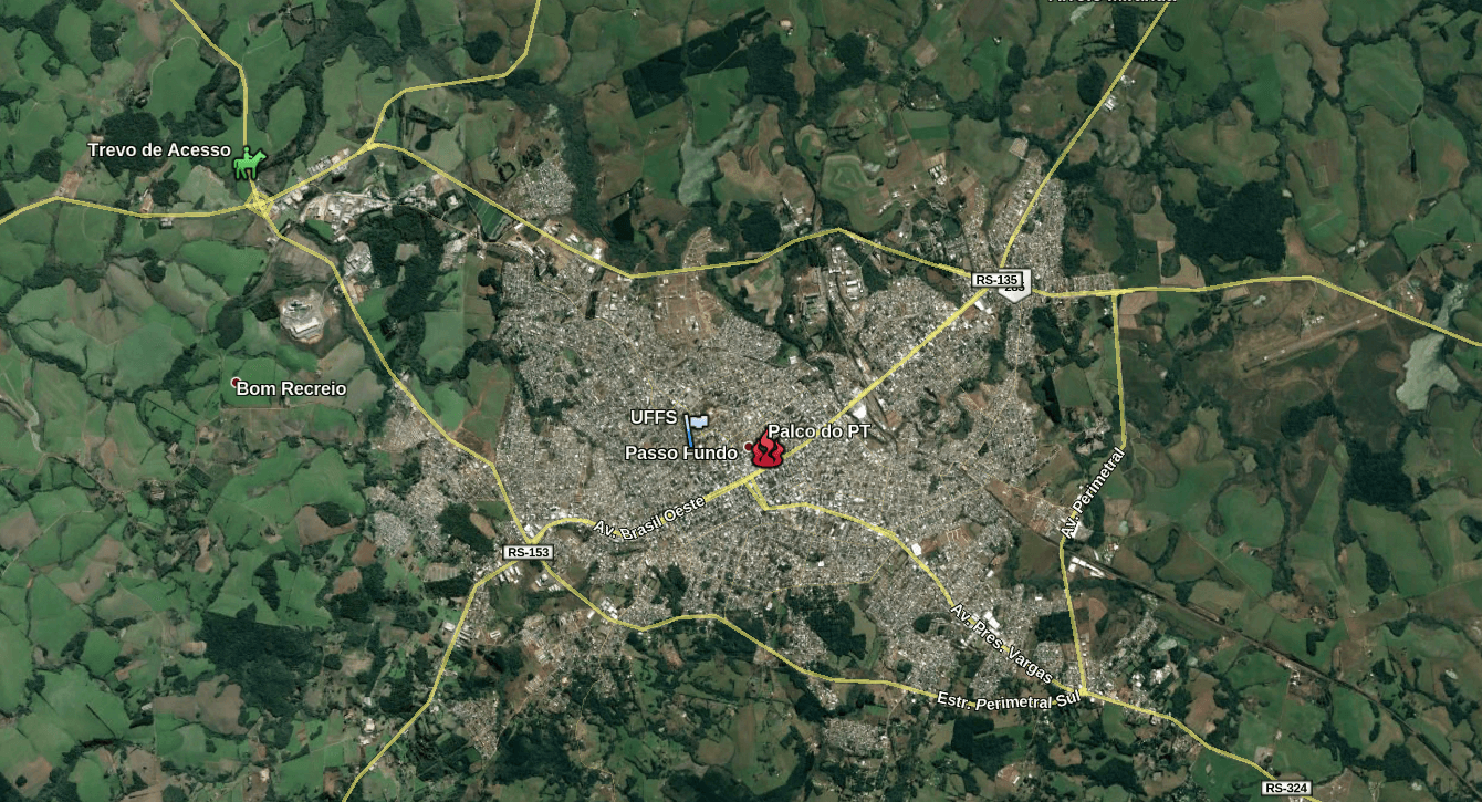 Em Passo Fundo, no dia 23, deu tudo errado para os petistas. Eventos simultâneos com grupos organizados e também indivíduos que saíram para protestar de forma independente, foram concentrados em três pontos da cidade. No centro, na esquina da Avenida Brasil com a Bento Gonçalves (insistentemente chamada de “Esquina Democrática” por alguns), na sede da Universidade Federal da Fronteira Sul (UFFS) e (o maior de todos) no trevo de acesso à cidade, no entroncamento das BRs 285 e 324 – rota para quem vem da região de Ronda Alta e Pontão – cidades na rota da caravana.