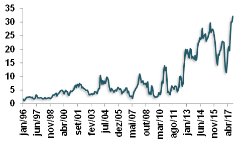 Para a fortíssima elevação da energia elétrica em 2015, também pesou a escassez de chuvas, que resultou no racionamento hídrico e energético. Em 2016, houve algum alívio, a partir da redução das tarifas de Itaipu e pela queda dos dispêndios relacionados à CDE. Já em 2017, novamente, a inflação de 10,4% da energia elétrica foi substancial. Apesar da grande variabilidade desde 2011, o crescimento acumulado foi maior do que o IPCA cheio.