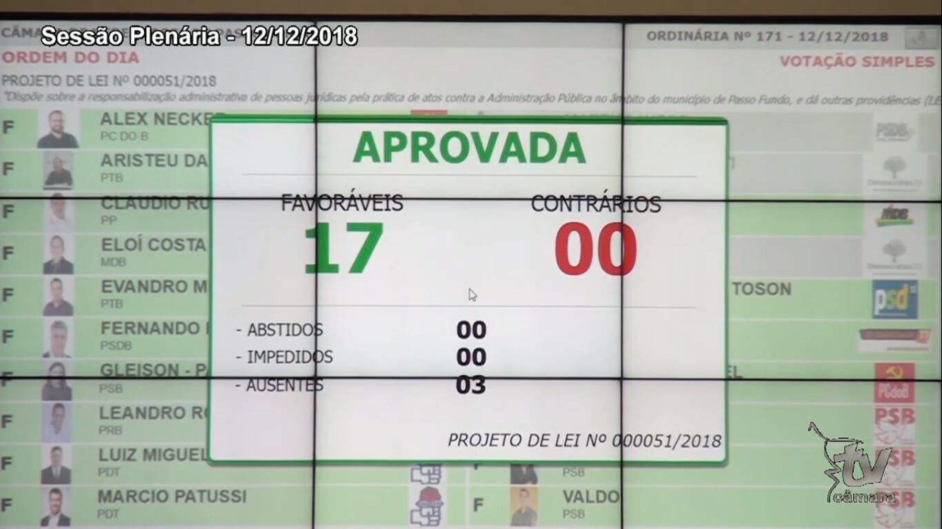 Aprovado o PL 051/2018, de autoria do gabinete do vereador Dalla Lana, que dispõe sobre a responsabilização administrativa de pessoas jurídicas pela prática de atos contra a Administração Pública no âmbito do município de Passo Fundo (LEI ANTICORRUPÇÃO)”.