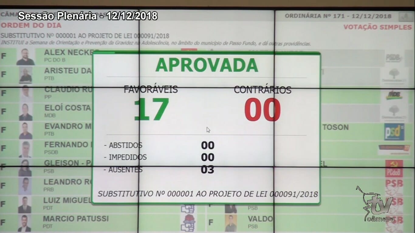 Aprovado o Substitutivo n. 001 ao PL 091/2018, de autoria do Gabinete do vereador Luiz Miguel Scheis, que institui a Semana de Orientação e Prevenção da Gravidez na Adolescência, no âmbito do município de Passo Fundo.