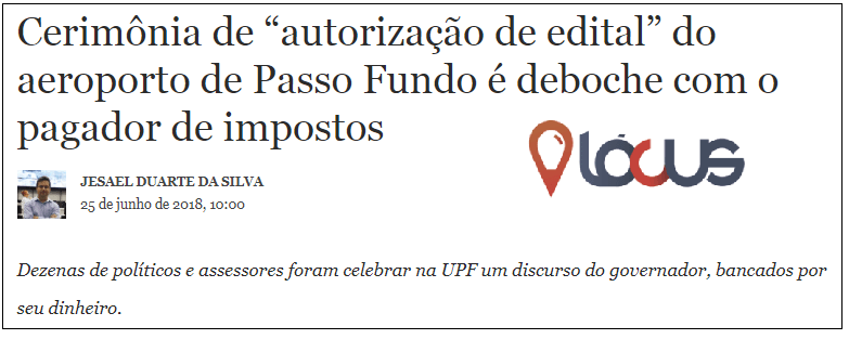 É uma sugestão para Luciano Azevedo. A população está mais atenta com os gastos desenfreados, com a ineficiência da gestão pública e com o uso do dinheiro dos impostos. É o que os passo-fundenses querem: mais eficiência e menos publicidade.