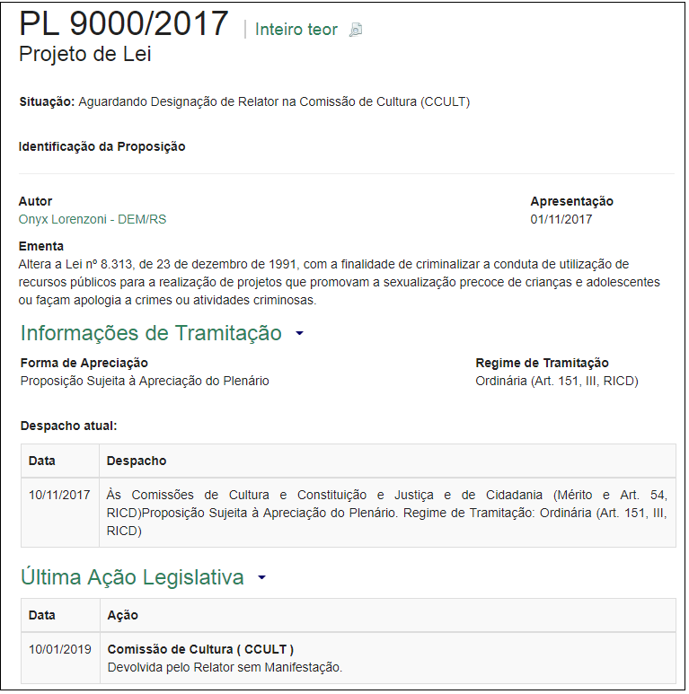 Tramita na Câmara o Projeto de Lei 9000/17, do agora Ministro da Casa Civil Onyx Lorenzoni (DEM/RS), que criminaliza o uso de recursos públicos para a realização de projetos artísticos que promovam a sexualização precoce de crianças e adolescentes ou façam apologia a crimes ou atividades criminosas.