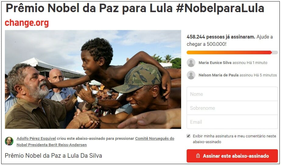 Para dar seguimento à sua promessa, Esquivel criou abaixo-assinado no site “Chance.org”. Até a data de ontem (dia 15, 23:29), mais de 458 mil pessoas haviam assinado. Justificou escrevendo: “Por meio desta carta, gostaria de apresentar a esta Comissão a candidatura ao Prêmio Nobel da Paz de Luiz Inácio ‘Lula’ da Silva, ex-Presidente da República Federativa do Brasil entre 2003 e 2010, que através de seu compromisso social, sindical e político, desenvolveu políticas públicas para superar a fome e a pobreza em seu país, uma das desigualdades mais estruturais do mundo”. Abaixo, é possível ver a imagem do site:
