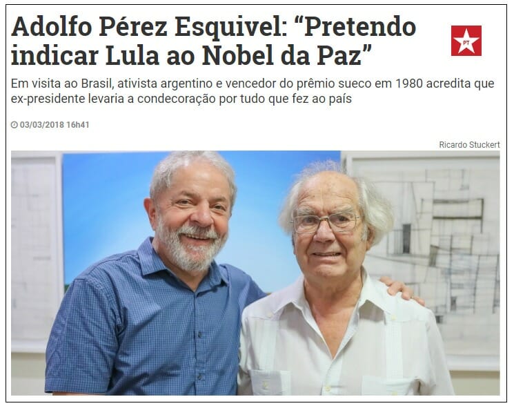 Em visita ao Brasil no ano passado, o ativista argentino havia mencionado que pretendia indicar Lula, pois acredita que ex-presidente levaria a condecoração “por tudo que fez ao país”. Abaixo, o site do Partido dos Trabalhadores havia noticiado a visita do argentino em 2018: