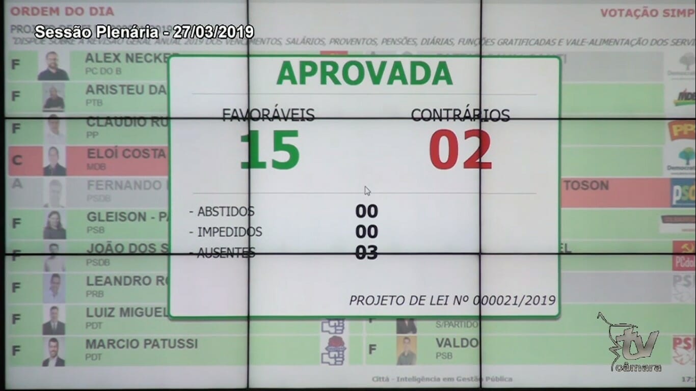 Aprovado o PL 021/2019 com Mensagem Retificativa, de autoria do Poder Executivo Municipal, que dispõe sobre a revisão geral anual 2019 dos vencimentos, salários, proventos, pensões, diárias, funções gratificadas e vale-alimentação dos servidores públicos municipais da administração direta, autárquica e fundacional e dos subsídios dos agentes políticos do poder executivo.