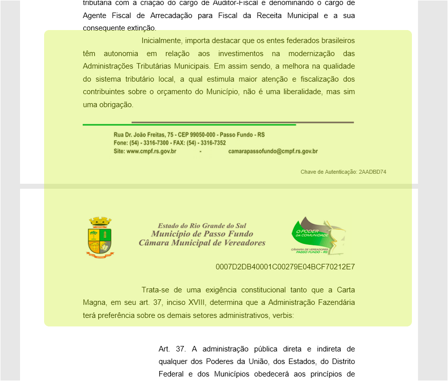 “Portanto, a criação do cargo de Auditor-fiscal de Tributos Municipais e a consequente extinção do cargo de Agente Fiscal de Arrecadação tem como finalidade cumprir com as exigências constitucionais, na presente proposta está a previsão de criação de 06 cargos, frente ao comprometido orçamentário-financeiro, entretanto a demanda tributária tranquilamente abarcaria a criação de 30 auditores-fiscais.