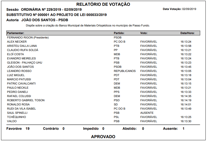 Aprovado o Substitutivo 01 ao PL 33/2019, de autoria do Gabinete do vereador João dos Santos (PSDB), que dispõe sobre a criação do Banco Municipal de Materiais Ortopédicos no município de Passo Fundo.
