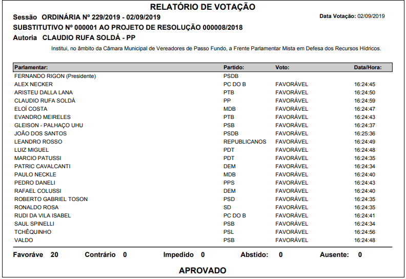 Aprovado o Substitutivo 01 ao Projeto de Resolução 08/2018, de autoria do Gabinete do vereador Rufa (PP), institui, no âmbito da Câmara Municipal de Vereadores de Passo Fundo, a Frente Parlamentar Mista em Defesa dos Recursos Hídricos.