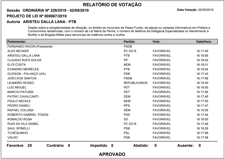 De autoria do Gabinete do vereador Aristeu Dalla Lana (PTB), foi APROVADO o PL 67/2019 dispõe sobre a obrigatoriedade de afixação, no âmbito do município de Passo Fundo, de placas ou cartazes informativos em prédios e condomínios residenciais, com o número da Lei Maria da Penha, o número de telefone da Delegacia Especializada no Atendimento à Mulher e da Brigada Militar para denúncias de violência contra a mulher.