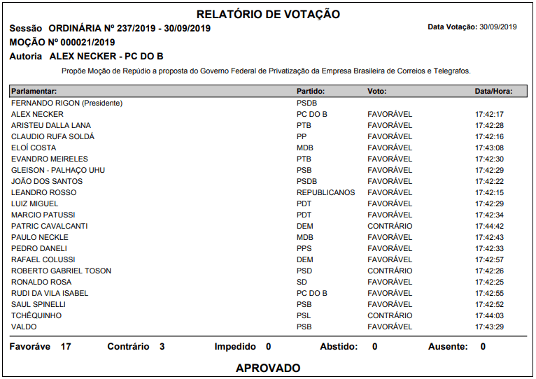Aprovada a Moção 021/2019, de autoria do vereador Alex Necker (PCdoB), de repúdio a proposta do Governo Federal de Privatização da Empresa Brasileira de Correios e Telégrafos.