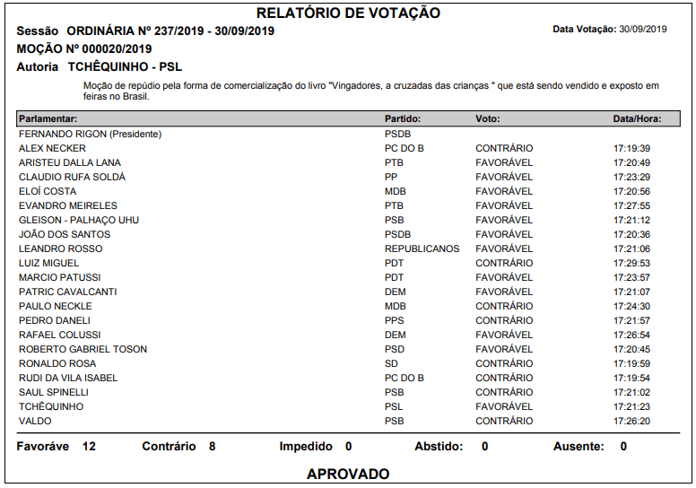 Aprovada a Moção 020/2019, de autoria do Gabinete do vereador Tchêquinho (PSL), de repúdio pela forma de comercialização do livro “Vingadores, a cruzadas das crianças”, que está sendo vendido e exposto em feiras no Brasil. Trata-se de uma novela gráfica que apresenta super-heróis gays e um beijo entre dois homens.