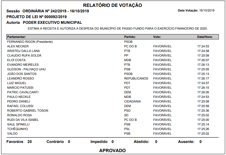 Aprovado o PL 92/2019, de autoria do Poder Executivo Municipal, que estima a receita e autoriza a despesa do município de Passo Fundo para o exercício financeiro de 2020. O Projeto de Lei está orçado em R$ 710.455.000,00 (setecentos e dez milhões e quatrocentos e cinquenta e cinco mil reais). O valor orçado tem como base os preços vigentes no mês de agosto de 2019.
