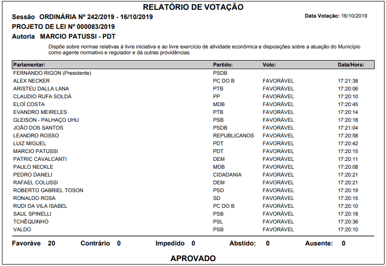 Aprovado o PL 83/2019, de autoria do Gabinete do vereador Marcio Patussi (PDT), que dispõe sobre normas relativas à livre iniciativa e ao livre exercício de atividade econômica e disposições sobre a atuação do Município como agente normativo e regulador.