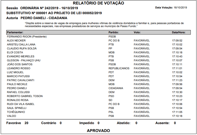 Aprovado o Substituto 01 ao PL 52/19, de autoria do Gabinete do vereador Pedro Daneli (Cidadania), que dispõe sobre a reserva de vagas de empregos para mulheres vítimas de violência doméstica e familiar e, para pessoas portadoras de necessidades especiais, nas empresas prestadoras de serviços ao município de Passo Fundo.