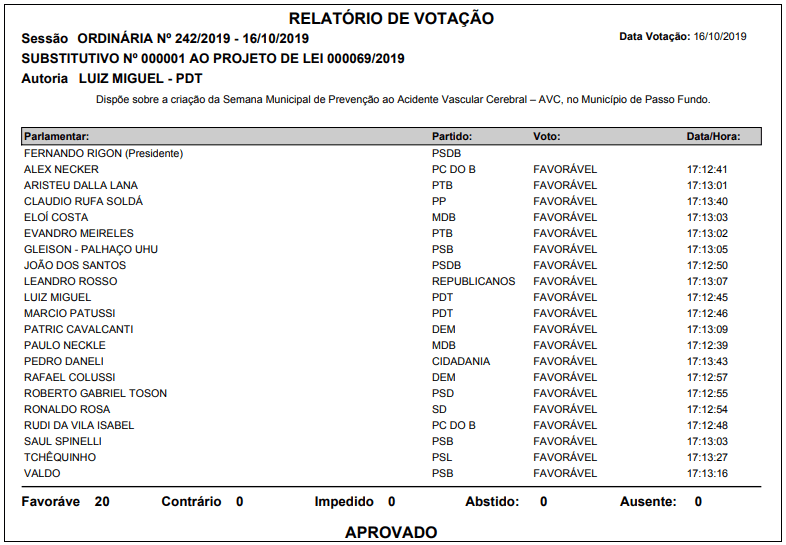 Aprovado o Substitutivo 01 ao PL 69/2019, de autoria do Gabinete do vereador Luiz Miguel Scheis (PDT), que dispõe sobre a criação da Semana Municipal de Prevenção ao Acidente Vascular Cerebral (AVC) no Município de Passo Fundo. Ocorrerá anualmente na semana que compreender o dia 29 de outubro, data que se comemora o “Dia Mundial do Combate ao Acidente Vascular Cerebral”.