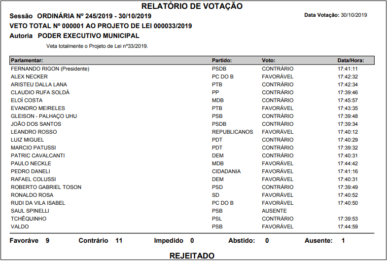 O Veto total 01 ao PL 33/2019, de autoria do Poder Executivo Municipal, que DISPÕE SOBRE A CRIAÇÃO DO BANCO MUNICIPAL DE MATERIAIS ORTOPÉDICOS NO MUNICÍPIO DE PASSO FUNDO, de autoria do Vereador João dos Santos (PSDB), foi REJEITADO com 11 votos.