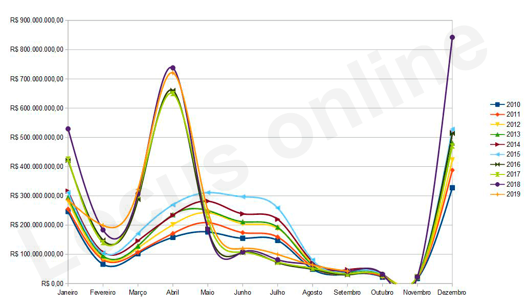 Arrecadação do IPVA entre os anos de 2010 e 2019 (parcial). Até 2016, o dinheiro entrava de forma mais distribuída. Com alterações no calendário, os picos janeiro-abril-dezembro ficaram mais acentuados.