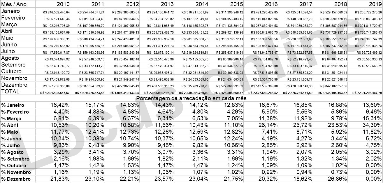 Tabelão do IPVA: quando e quanto o governo arracadou, mês a mês, entre 2010 e 2019 (até setembro).