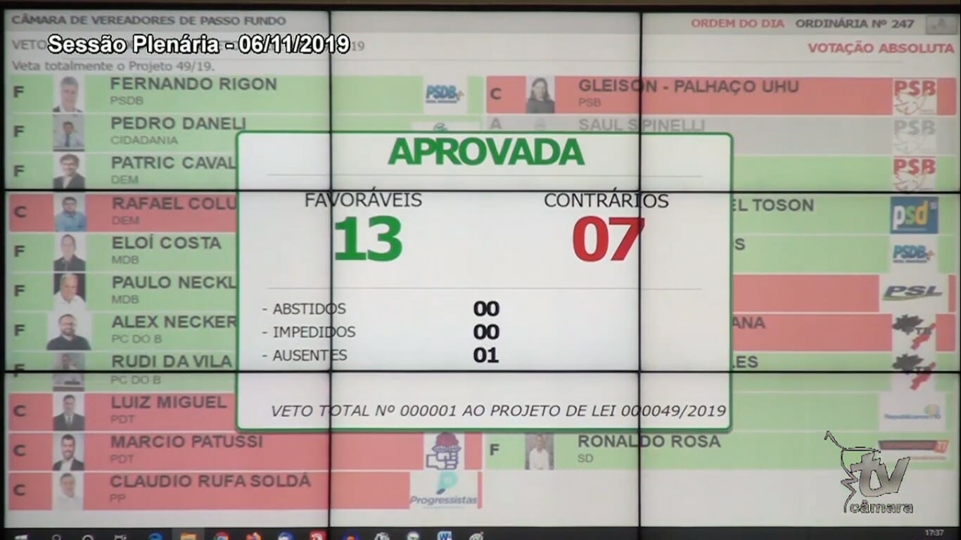No vídeo abaixo, é possível acompanhar a votação e as discussões. Leandro Rosso, no entanto, sai nitidamente constrangido por se posicionar contrariamente a um projeto de sua autoria. Informou que, conforme o regimento da Casa, irá apresentar a proposta como indicação ao Poder Executivo Municipal. O veto foi aprovado com 13 votos favoráveis e 7 contrários.