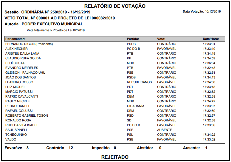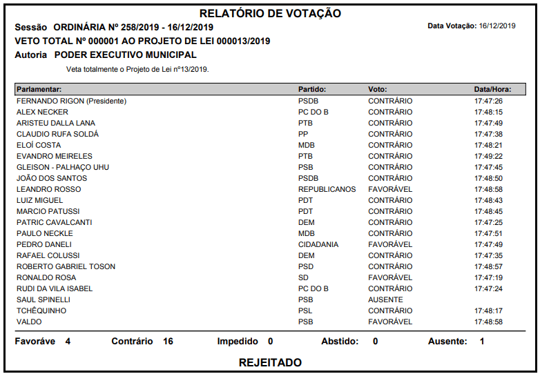 Rejeitado o Veto total ao PL 13/2019, que dispõe sobre a regularização fundiária urbana no município de Passo Fundo. O projeto originário é de autoria do gabinete do vereador Patric Cavalcanti (DEM).