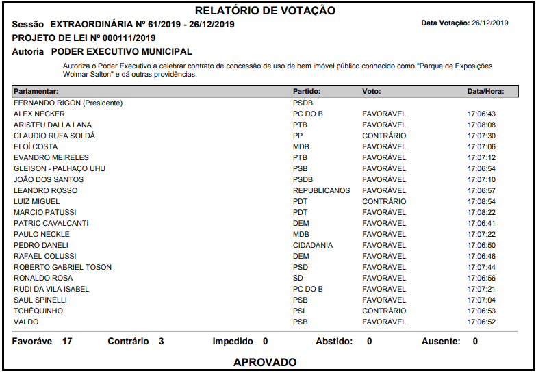 Aprovado o PL 111/2019, de autoria do Poder Executivo Municipal, para a concessão de uso do imóvel de propriedade do Município, conhecido como “Parque de Exposições Wolmar Salton”, com área superficial de 78.900,00-m², constituída de benfeitorias (pavilhões, sanitários, palco de shows, entre outros).