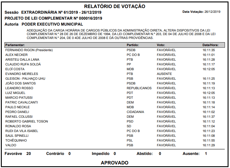 Aprovado o PLC 16/2019, de autoria do Poder Executivo Municipal, que tem como objetivo a redução da carga horária, de 44 para 40 horas/semanais, dos cargos públicos de armador de ferro, lavador de máquinas pesadas, serventes, vigilantes pela Lei Complementar n.º 28/1994 e alterações na Lei Complementar n.º 103/2002, sem prejuízo da diminuição dos vencimentos, com o intuito de contemplar a mesma redução de carga horária dos cargos e ou empregos públicos com mesma função.