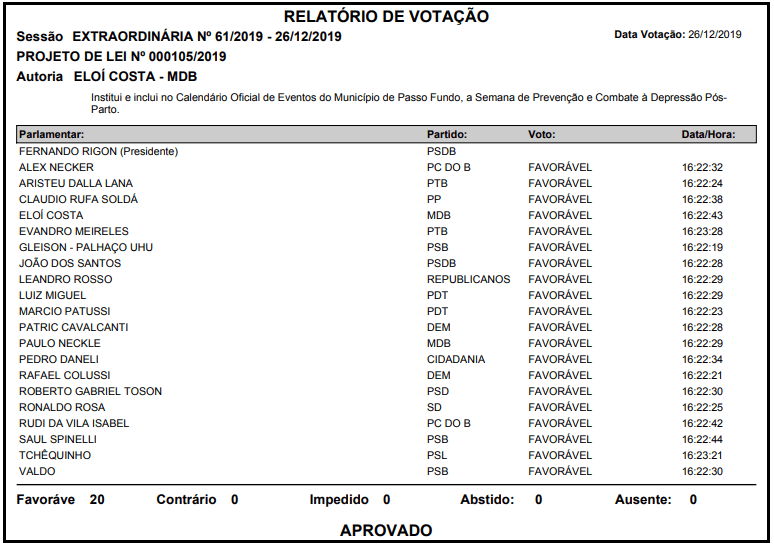 Aprovado o PL 105/2019, de autoria do gabinete do vereador Eloí da Costa (MDB), que institui e inclui no Calendário Oficial de Eventos do Município de Passo Fundo a Semana de Prevenção e Combate à Depressão Pós-Parto, a ser realizada, anualmente, na semana de 8 de março – Dia Internacional da Mulher.