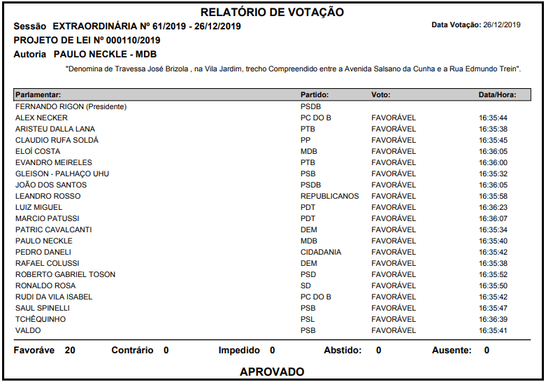 Aprovado o PL 110/2019, de autoria do gabinete do vereador Paulo Neckle (MDB), que denomina de Travessa José Brizola, na Vila Jardim, o trecho compreendido entre a Avenida Salsano da Cunha e a Rua Edmundo Trein.