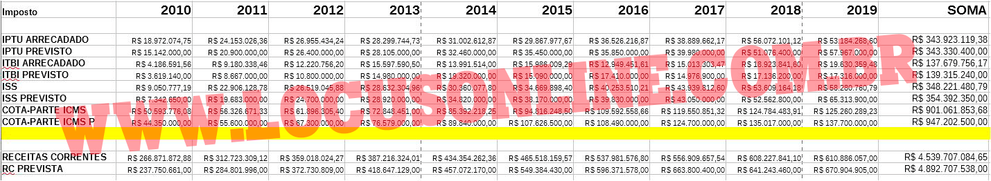 A soma dos impostos aqui elencados e muitos outros nesta década foi bilionária: entre 2010 e 2019, os relatórios da Prefeitura mostram Receitas Correntes que somam 4,5 bilhões de Reais, só um pouco abaixo da previsão para a década (4,8 bilhões). O IPTU, sozinho, representou só 7,58% deste montante no período.