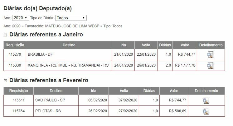 Tanto a Transparência do Estado do Rio Grande do Sul quanto o site da Assembleia Legislativa, na página dedicada ao deputado Mateus Wesp (PSDB), mostram o pagamento de uma diária para o parlamentar passo-fundense: em fevereiro para São Paulo – SP, com ida em 6/2/2020 e volta no dia seguinte. O montante é de R$ 744,77. Valores de passagens aéreas e estadia em hotéis ainda não foram informados pelo site da Assembleia, o que ocorre posteriormente.