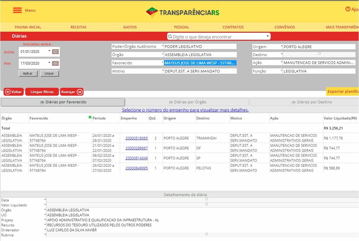 Acima: indicação da retirada de diária para o deputado Mateus Wesp no site da AL e no Transparência RS.