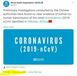 “Investigações preliminares conduzidas por autoridades chinesas não encontraram evidência de transmissão entre humanos” Organização Mundial da Saúde – 14 de janeiro de 2020.