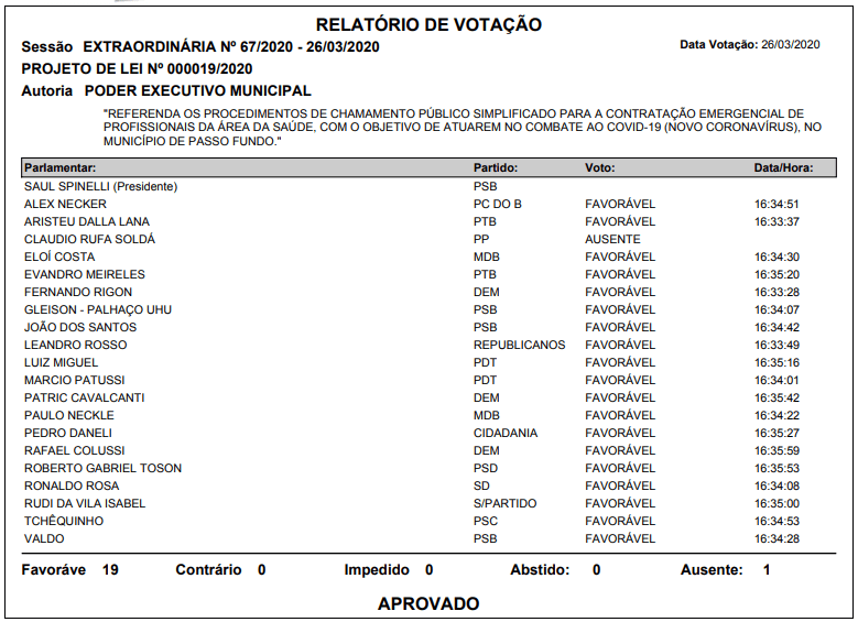 Com isso, Passo Fundo quer ampliar a oferta de assistência médica durante o período de controle do Corona Vírus, sobretudo nas semanas mais críticas. Conforme relatório de votação abaixo, o projeto foi aprovado por unanimidade: