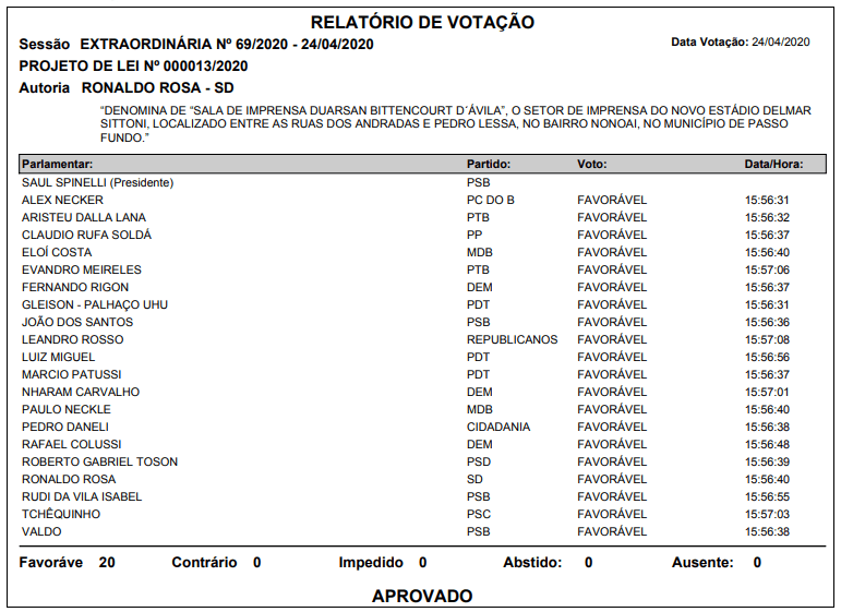 Aprovado o PL 13/2020, de autoria do gabinete do vereador Ronaldo Rosa (SD), que denomina de “SALA DE IMPRENSA DUARSAN BITTENCOURT D’ÁVILA” o setor de imprensa do novo Estádio Delmar Sittoni, localizado entre as Ruas dos Andradas e Pedro Lessa, no Bairro Nonoai, no município de Passo Fundo.