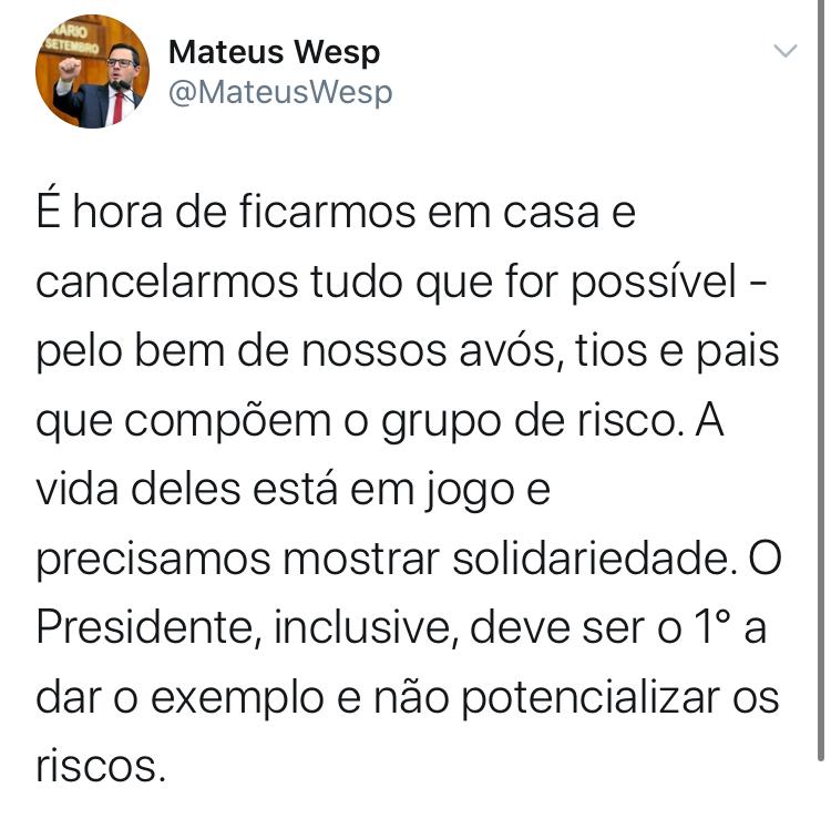 O governador Eduardo Leite e seu homem na Assembleia Legislativa (e Deputado Estadual com base em Passo Fundo) Mateus Wesp – companheiros de partido, o PSDB – estão entre os líderes na sustentação quase diária do discurso de combate a pandemia, obviamente com as regras criadas por eles mesmos. Abaixo, uma amostra do que é bombardeado pelo deputado nas redes sociais. As recomendações, avaliações e reflexões sobre o comportamento humano são impressionantes: