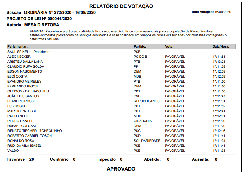 Aprovado o PL 41/2020, de autoria da Mesa Diretora, que reconhece a prática da atividade física e do exercício físico como essenciais para a população de Passo Fundo em estabelecimentos prestadores de serviços destinados a essa finalidade em tempos de crises ocasionadas por moléstias contagiosas ou catástrofes naturais.