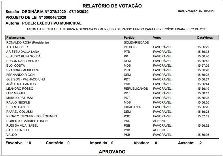 Aprovado o Projeto de Lei 46/2020, de autoria do Poder Executivo Municipal, que submete à apreciação deste Poder Legislativo a proposta orçamentária do Município para o exercício de 2021, em cumprimento ao disposto no artigo 165, § 5º, da Constituição Federal e no inciso III do artigo 155 da Lei Orgânica do Município de Passo Fundo.