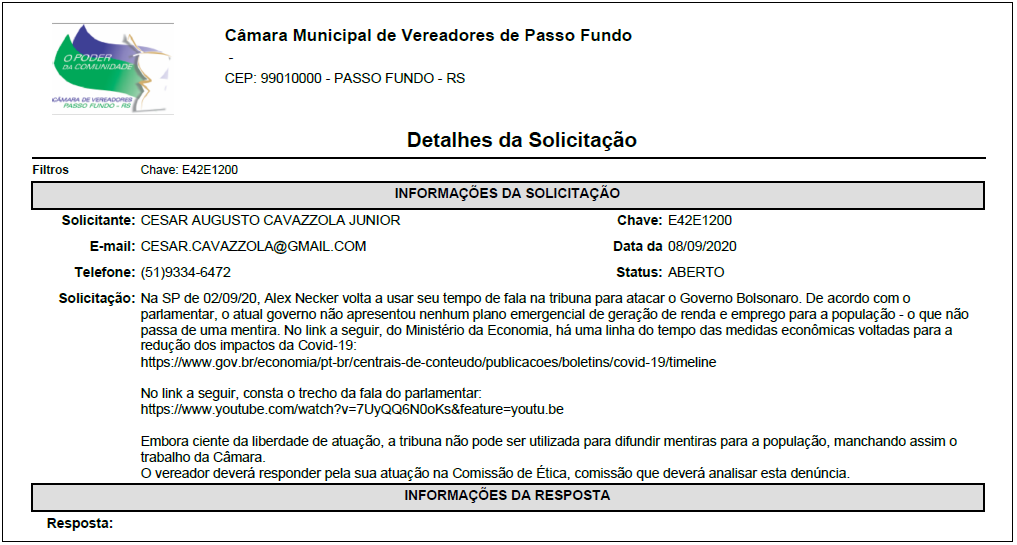Diante dessa situação, em 08 de setembro, o autor deste texto, por meio da Ouvidoria da Câmara de Vereadores de Passo Fundo, fez uma manifestação acerca do discurso de Alex Necker na tribuna. Reiterando aquilo que foi dito: “Embora ciente da liberdade de atuação [do parlamentar], a tribuna não pode ser utilizada para proferir mentiras para a população, manchando assim o trabalho da Câmara [de Vereadores de Passo Fundo]”.