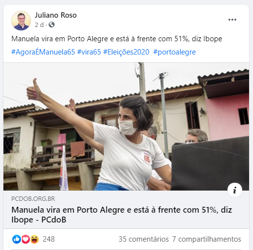 Nosso maior comunista estava esperançoso e acreditando na pesquisa do IBOPE na noite de sábado, véspera da eleição. Em seu Facebook, postou notícia do próprio partido sobre a “virada” de Manuela.